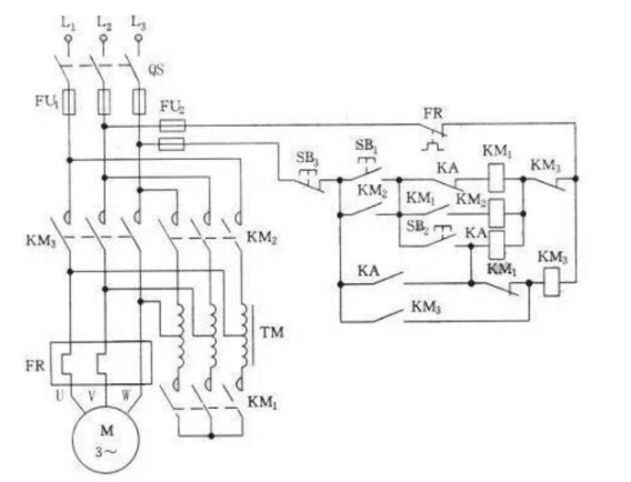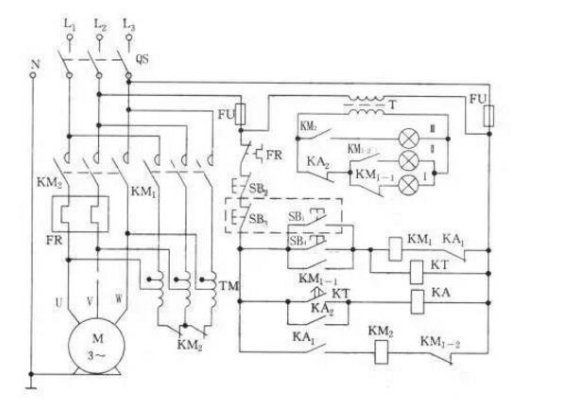 控制器:由KM1,KM2,KM2接觸器,KT,中間繼電器KA和SB1、SB4和起動(dòng)按鈕SB2、SB3組成。二個(gè)啟動(dòng)按鈕并聯(lián),兩個(gè)停機(jī)按鈕串聯(lián)組成了兩地控制功能。SB1、SB3(虛線框)組成了甲地控制的啟動(dòng),停止按鈕。SB4,SB2組成了控制的啟動(dòng),停止按鈕。